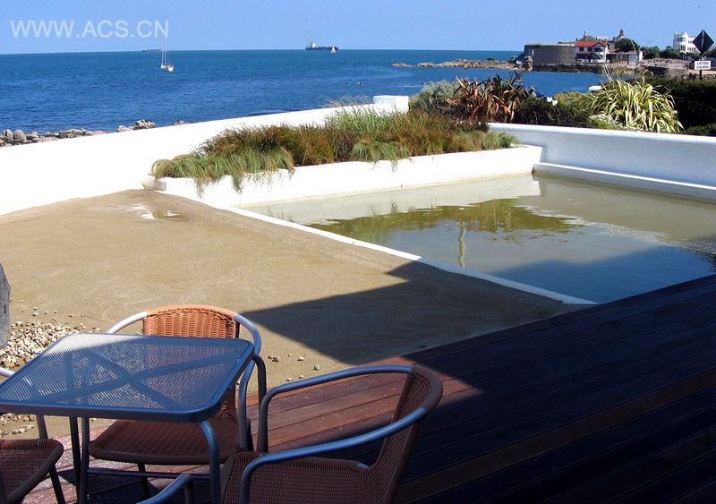 本案水景观可以分为两层。两个池塘都覆盖有沙层和疏松的卵石。用水泵慢慢地把下层的水抽到上层去,就像是小型的潮汐一样,当循环再次开始,池水才又慢慢地从上层流下来。底层的沙子被水覆盖着,不曾晒过日光。但是当上层的水流渐渐退去,可以依稀见到下面的沙层。在干旱的日子里,也能看到干湿转变的颜色变化带来的影响。设计师在上层池塘设置了三块黑色玄武岩岩石。对于设计师来说,这些岩石就像是远航的船只或者是海洋的生物。但无论像什么,这些岩石都是为了仿照Howth Head而被安置在此处的,它看来就像是暴雨倾盆中迷失航向的远航船。