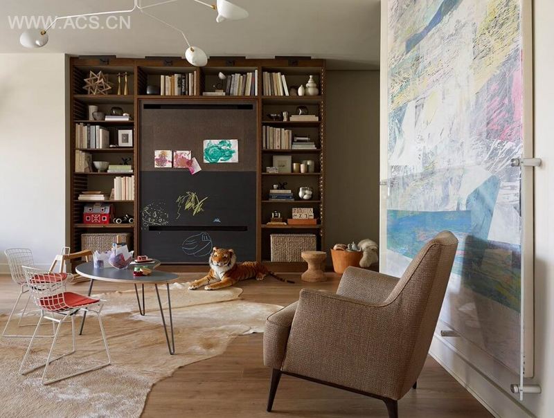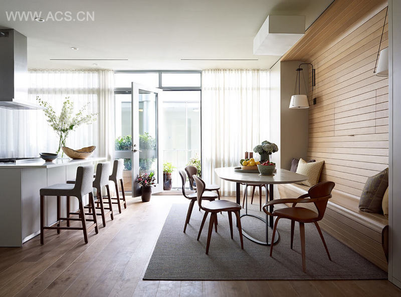 This loft had generous spaces to begin with but it needed warming up with color and texture. Kevin Dumais, the interior designer, deftly provided these elements. We reconfigured the layout, the HVAC system and designed much of the millwork including the undulating walnut banquette bench that conceals a TV.