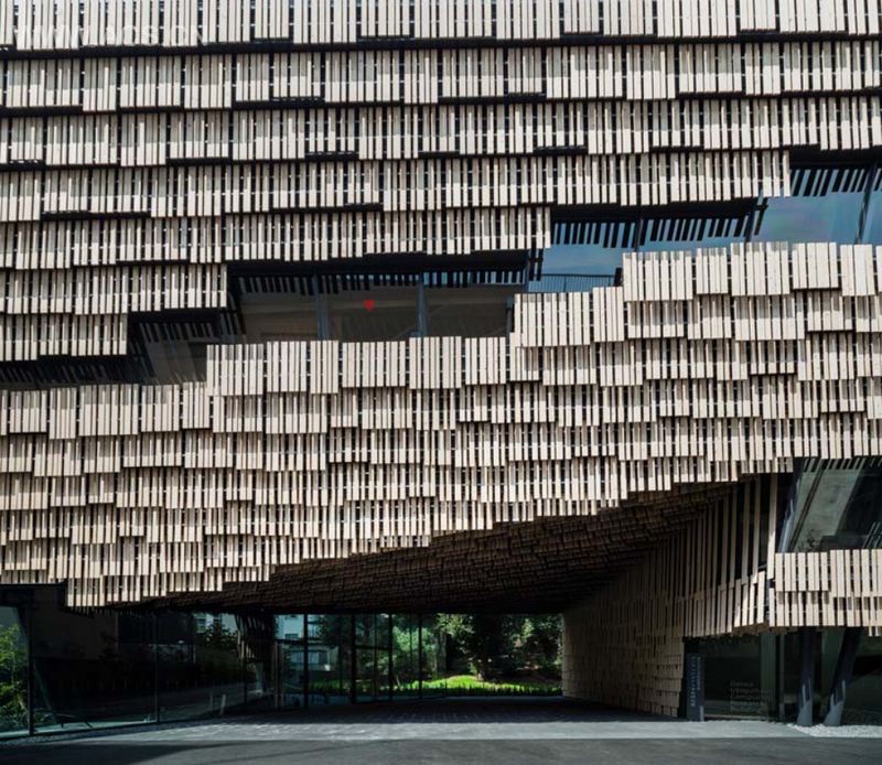 隈研吾建筑都市设计事务所已经完成了日本的"大和普适计算研究大楼"的设计,该大楼是东京大学校园里的一栋建筑。一般情况下,这种类型的建筑都采用硬质材料,但是该大楼却采用了自然元素,以此打造出流畅、布置有机的建筑正面。除室内外娱乐区以外,该大楼里还设有美术馆与演讲室。