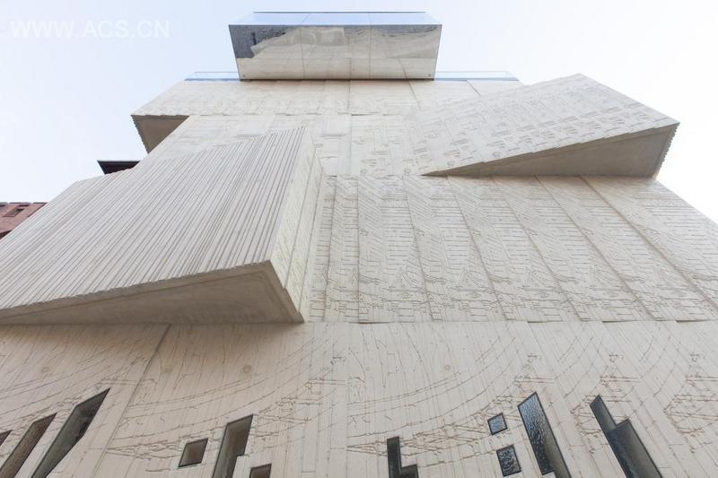 项目坐落在柏林,由俄罗斯建筑师Sergei Tchoban和Sergey Kuznetsov 设计。建筑分作五层,底层是入口大厅,中间三层是展厅,顶层是一个全透明的玻璃盒子,用来举办各种活动。各种建筑草图被当做图腾一样镌刻在建筑的外墙上,米黄色调的石材上,炫耀着那属于设计师的优越感...