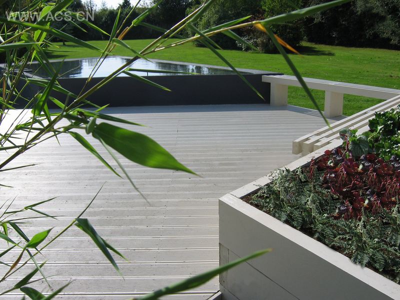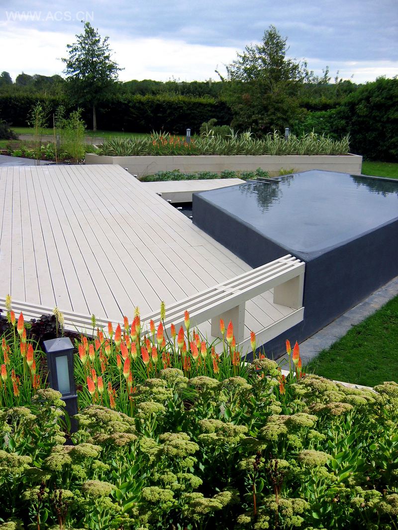 本案设计比第一眼印象要来得复杂。复杂性源于其设计必须保持自然的几何形体。这个几何形体是由具有挑战性的建筑物所造就的。搭建在十一个不同水平面的平台之上,花园是一个由石头路、油漆过的硬木铺板、隔离开的水景观和以油漆处理过的木材建造而成的一系列上升刨床组成的有机体。这些刨床倾斜的角度非常关键,有助于强化露台区域的开放性,也有助于上面的池水倒影着天空,捕捉到西边更宽广的天空景观。住宅背对SW,它的大阳台后面是日光室。这个大阳台为用餐和放松提供充分的空间。池塘高于甲板45厘米,正如设计师说的,池面就像是天空的一面镜子,在夜晚的灯光下显得格外漂亮。水通过石头的缝隙,越过池塘流到下面去。连接起甲板和草坪的木桥横跨过下面的池塘。露台花园在整个冬季都很少排上用场,所种植的大多数是草本植物。