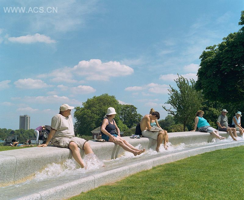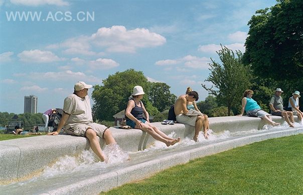 国伦敦海德公园内的戴安娜王妃纪念泉可谓是多年以来的经典水景观项目。该喷泉自2004年修好后,仅2005年便获得超过200万人的拜访,成为当年伦敦最热门的旅游景点。设计的理念基于戴安娜王妃生前的爱好与事迹,以 'Reaching Out - Letting In' . “敞开双臂--怀抱”为概念,设计了一个顺应场地坡度的,在树林中落脚的浅色景观闭环流泉。整个景观水路经历跌水,小瀑布,涡流,静止等等多种状态,反映了戴安娜起伏一生。
