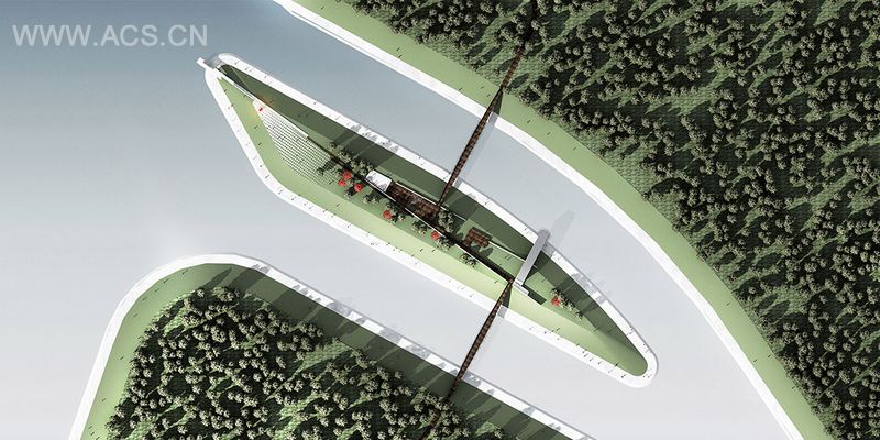 然茶室'、'秘密花园'几个景观节点。结构高效轻盈的步行桥,将小岛和两岸联通,也成为整个景观规划的一个重要部分。为最小化对场地自然片段