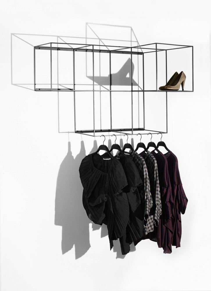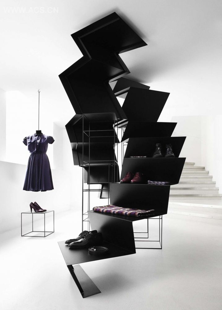 The project concerns a new concept store for V Ave SR, a Swedish fashion brand. V Ave S R works with traditional typologies of clothes but deconstructs them and create new hybrid garments. The assignment was to design an entirely new concept store that meets the commercial aspects of a retail space as well as to design the spatial encounter with the brand.The stairs has become the main spatial carriers of the retail concept V Ave S R, strong in siloutte gives a rapid identification. In addition to the stairs a shelving system was designed to meet the flexible needs of the store. The exposure has to adapt to the changing needs of a retail shop. The shelves consist of a rigorous work of steel rods, which together create a matrix of small cubic space in the structure, all with dimensions of 360x360x360 mm, perfect for haning clothes. By using the cubic dimensions of the structure, the clothes that hung in its bottom exposed in two directions, either along a wall, or by turning 90 degrees to allowfor a frontal exposure from a wall.To the shelf, hundreds of thin black steel plates were designed in order to make the shelf to become rearrangeable by changing the position of the plates. Both the visual aesthetics and the functionality of the shelves are radically changed by shifting the position of the plates. Not only the furniture has been custom made, but also the cash register, the doll exposure, fitting rooms, doors and the mirrors are special designed to enhance the overall shopping experience.