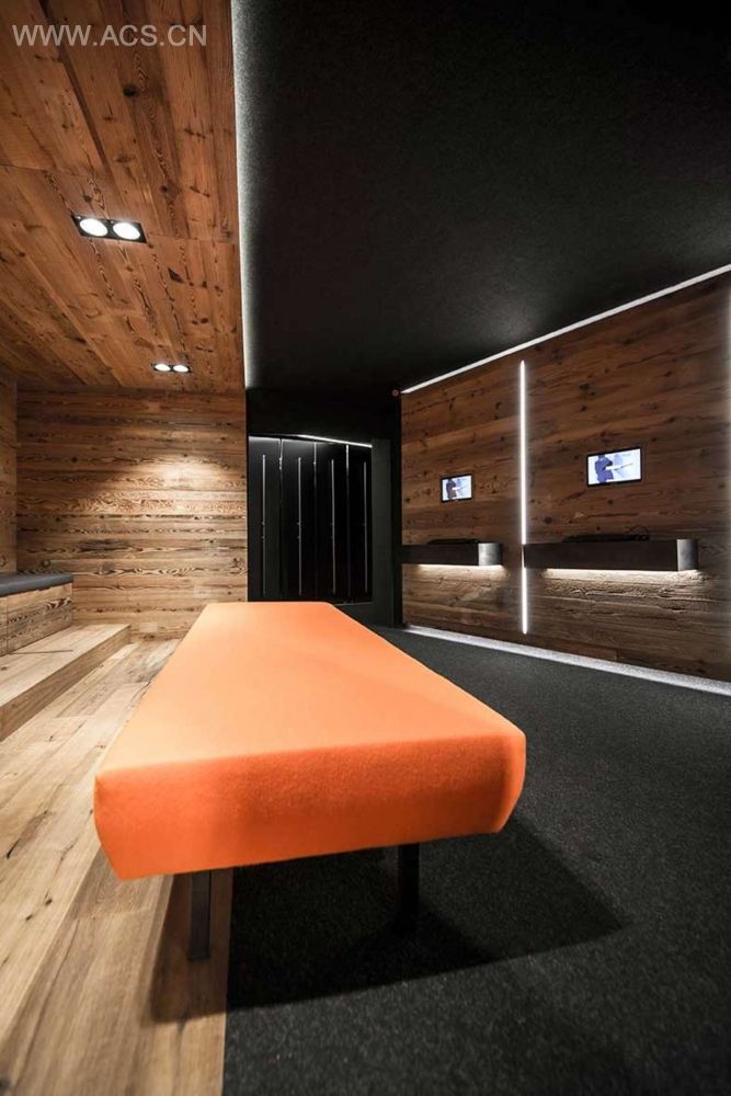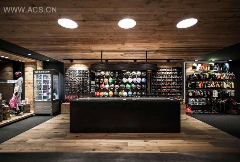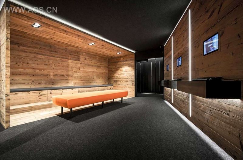 Floor and ceiling of dark felt confine the room without restricting it; the anthracite color makes the borders of the room not clearly visible. The extensive felt area absorbs disorderliness and noisiness. s of matured timber zone the space and create areas for the ski rental, sale and fitting. The furniture consists of a combination of matured timber and dark l and thus combines a traditional character with a contemporary touch.
