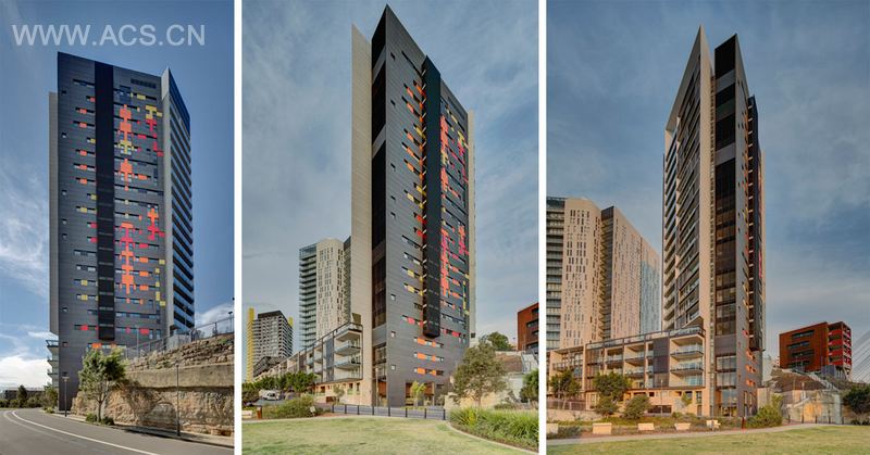 20层高的丝绸公寓位于悉尼中央商务区的西部,拥有得天独厚的景观视野。公寓标准层每层6户,设计巧妙的平衡采光与隐私间的关系。建筑外表皮拥有五颜六色不失优雅庄重的色彩和表情,每一个立面的形态都发生着变化。