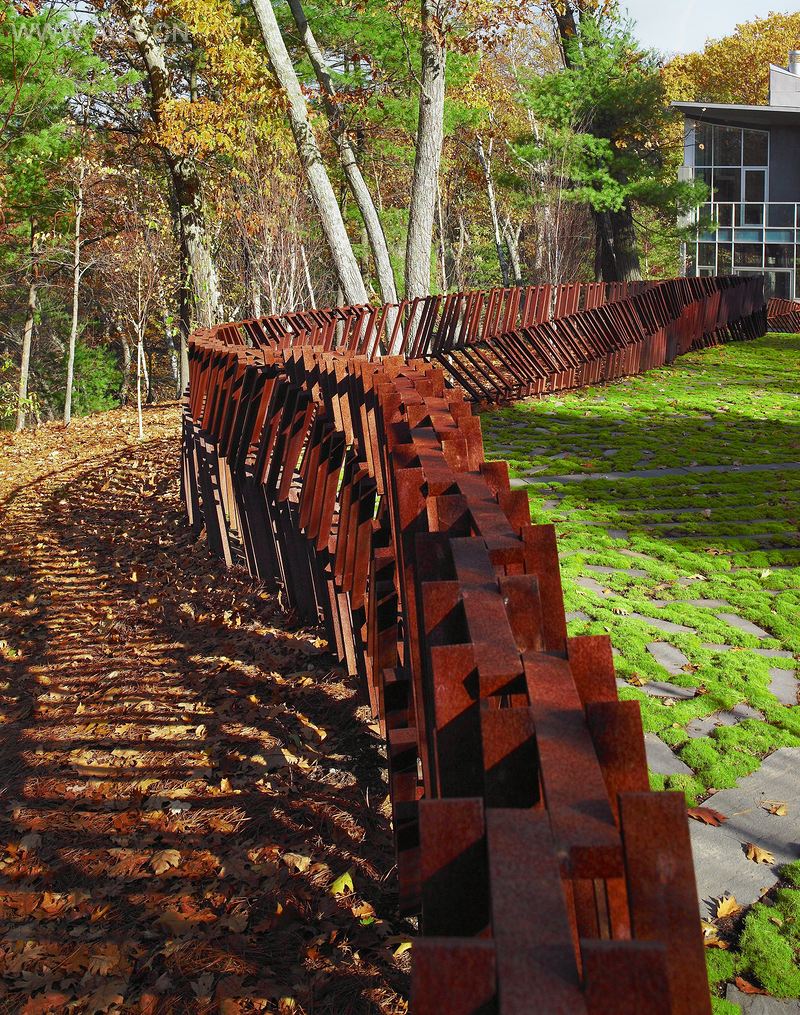 住宅坐落在当地一个3英亩大的硬木林内,可以一览法勒池的美景。法勒池与瓦尔登湖相接,瓦尔登湖是梭罗在马萨诸塞州林肯的住宅遗址。将现代建材和设计元素融入当地植物、天然涡蚀穴和冰砾阜地质等中是本案的设计目的。当地植物的色彩丰富,随着季节而改变,与原有的森林面貌融为一体。整齐的路障蔓延过森林的入口处和各种不同材质的地表之上,不着痕迹地划分开各个区域。景观设计反映出业主对土地管理发自内心的尊重;其中的现代设计元素则反映出业主对艺术和结构的兴趣。