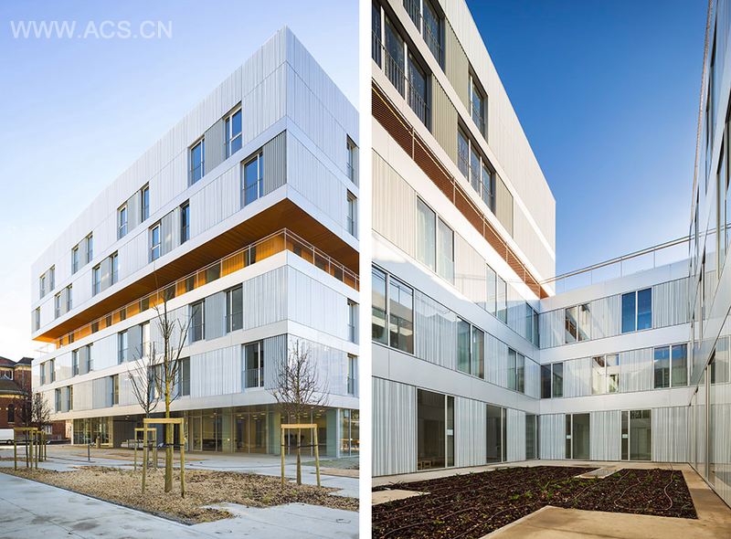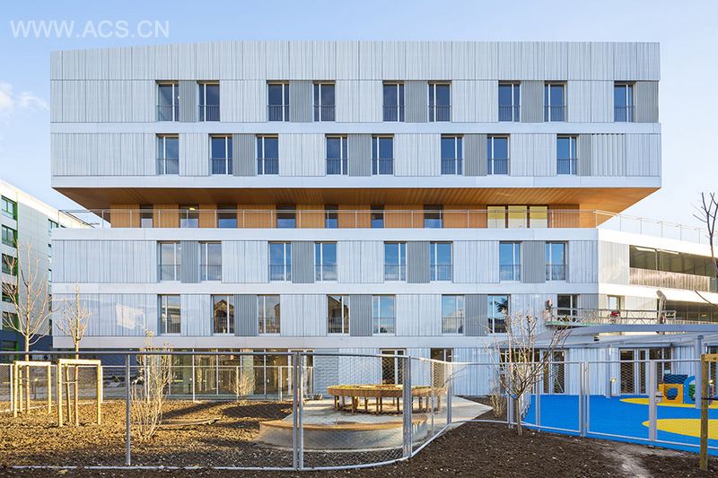 这栋位于巴黎14区,占地3公顷的建筑师养老院+托儿所的建筑集合体可为98位老人提供养老服务,为64个儿童提供托儿所服务。该项目推翻场地上原有的大部分建筑而重建,属于整个改造项目的第一期,建筑中心有两个内院,第四层体量向后回缩,形成舒适宽大的通廊,这一层的深暖色与建筑周身银色外观形成鲜明对比,点活了整个造型。所有老人居住的房间都沿外墙布置,每间均有自然光和外景。内部的走廊和公共空间因为内庭院的存在而变得光明。
