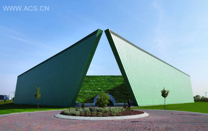 三角形建筑物是由两个12米高的壁限定,形状为梯形图中,包覆在预染(预翠绿)铜设置成直角彼此。正交壁的两个极端点似乎即将相互接触。