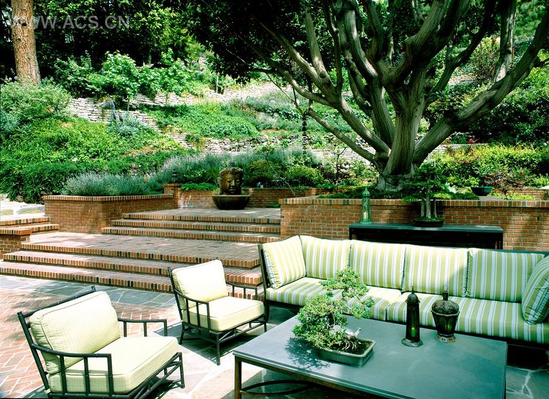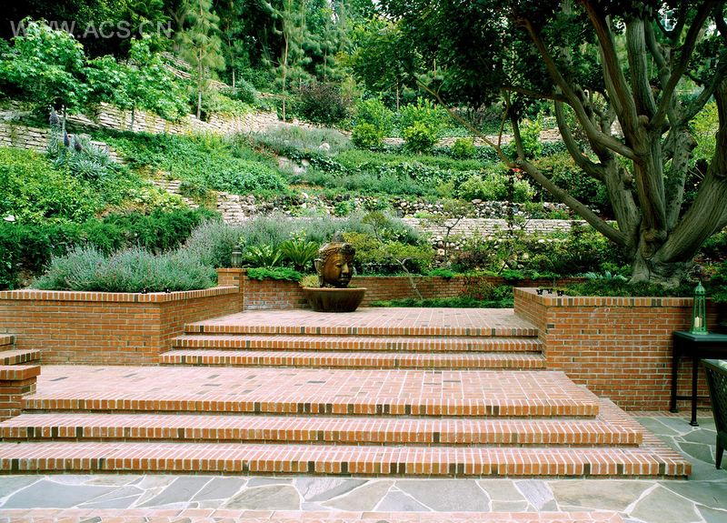 为了充分利用与其房产毗邻的山坡地段,索梅尔委托设计师重新设计本案的室外景观,以便将山坡美景融入其房产景观中。将山坡上的小路与地面的每条人行道联系起来,景观设计师引领参观者爬上山坡花园,来到一所日式花园(或者说是室内生活起居室)和一大片草地上。室外配有娱乐设施,室内则保持其私密性,供私人使用。为了给住宅留有足够的空间,建筑师在山坡正面保留了大片草地,拓宽进入住宅区的车道。新的入口通道使得驾驶者在通过草地的同时能浏览到一路上各种园林景观。停车场就在主要住宅建筑的面前。