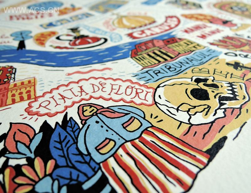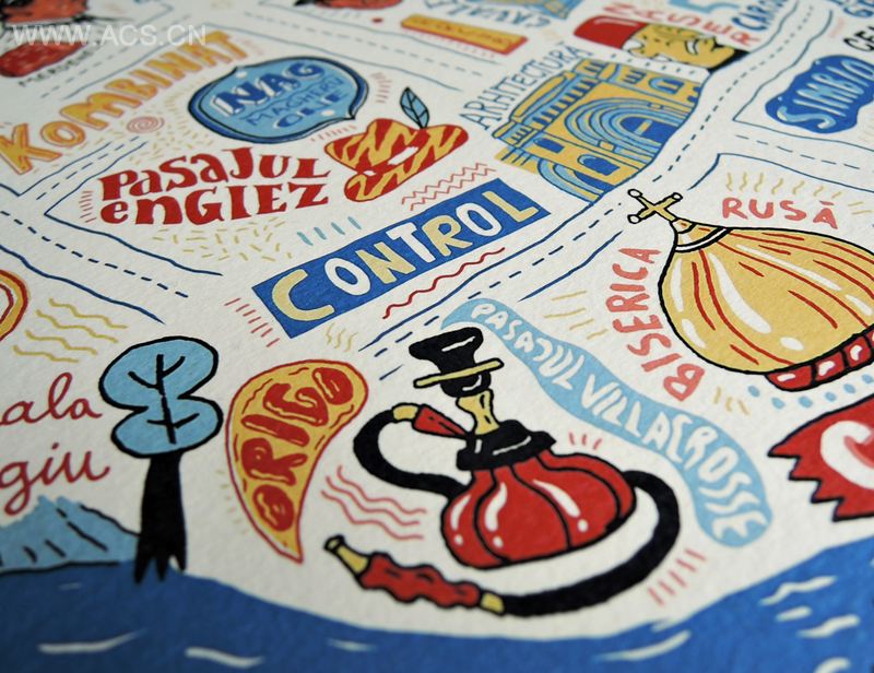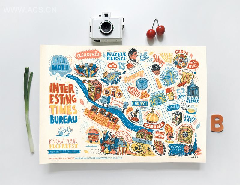 Bucharest旅游地图是一个在地图上以旅游景点名作为字体设计的灵感,就形成了一块完整的地图!