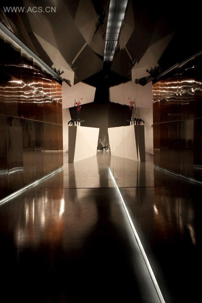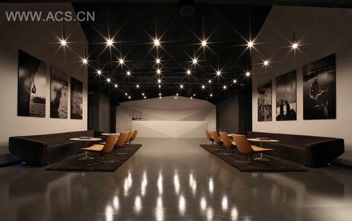 为了满足功能,办公室拥有多个出入口,其中最主要的主入口是一个高大的黑色的,几何状昏暗隧道,隧道尽头是休息室。设计同时规划了更为自由的动线。因为层高较高,设置了夹层空间。屋顶露台供董事长及董事会成员使用。装有柚木地板的屋顶露台空间布置了丰富的水景与植物,还有休闲家具。