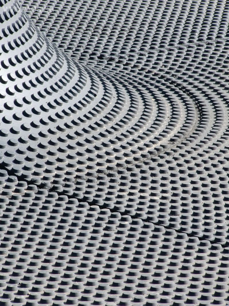 发车区域的混凝土壳被扭转变形覆盖调度中心。建筑从地面形状的改变开始使用一种与地面相似的材料,一种高性能混凝土。看似矛盾但很神奇,3cm厚的这种材料形成防滑的凸点表面,就像是乐高玩具(24mm见方,7mm厚,12mm间隙),构成了动态的形体。这满足了复杂的设计需求:不规则形体,持续变化的平面、密度、均质性、材料性能、精度、耐久性。这将地面从道路到建筑立面,到房顶和地库顶板全都连成了一体,完全模糊了建筑与周边的界限。建筑既是环境的起点也是终点。
