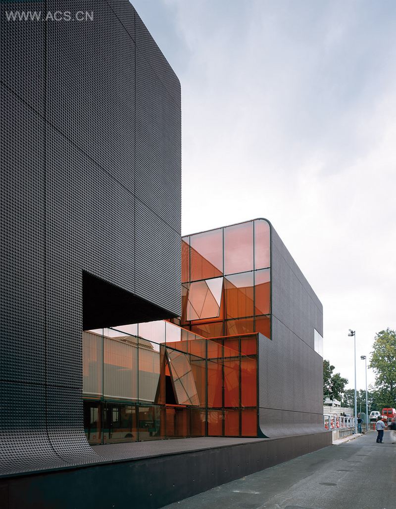 混凝土被整齐地切开,如同被壁纸刀切割出手术切口一样,露出反光的彩色玻璃空洞。玻璃的色彩受到了紧邻主路的涂有颜色的建筑立面的启发,使用了银色反光的点做装饰。