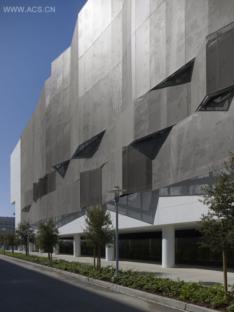 这是由WRNS工作室设计的旧金山27区停车场。该项目位于旧金山的天使湾重建区,此停车场在1420平方米上建起了七层高的大楼,并且连接了实验室和办公室。北部和东部的墙面,朝向公共的开发空间,都是多孔铝面板和加州红木森林材质制造而成的。这些图像是为了与周围的自然景观相搭配,并创建一个标准意义上的行人规范。南仰角处,面对一个繁忙的街道,设计成一个倾斜的石膏墙,这样树影斑驳,创建了非常有情趣的立面。地面是嵌在东南向的海拔高度上,创造了一个覆盖的人行道。这样的设计减轻了整个建筑铝面板和石膏墙的对地面水平的压力。