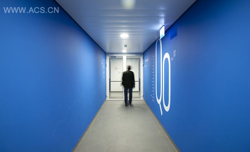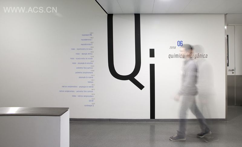 The graphic world of chemical equations is transferred onto the wayfinding system, through contractionof names and scale differences. On the floor of the laboratories, large areas are identified by large-scale applications, suitable for distant reading.