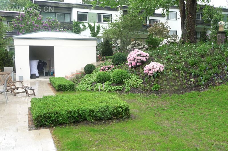 本案是业主在德国柏林伦多夫区上级阶层区的新家。家园里有一对夫妇和一个儿子。这个家庭想要一个兼具古典风格和现代风格的花园设计。来自波茨坦大学的建筑学教授吕弗勒老师接受了委托,担任本案的设计师。花园分有小前院和种有树木的陡峭后院。这里自1905年开始属于另一个别墅大花园。设计师尝试保留其历史因缘的同时,引入一些简单的植物,例如经过精心修剪的黄杨木和紫杉。草坪上的球状黄杨木看起来就像是快要滚下山的球体。