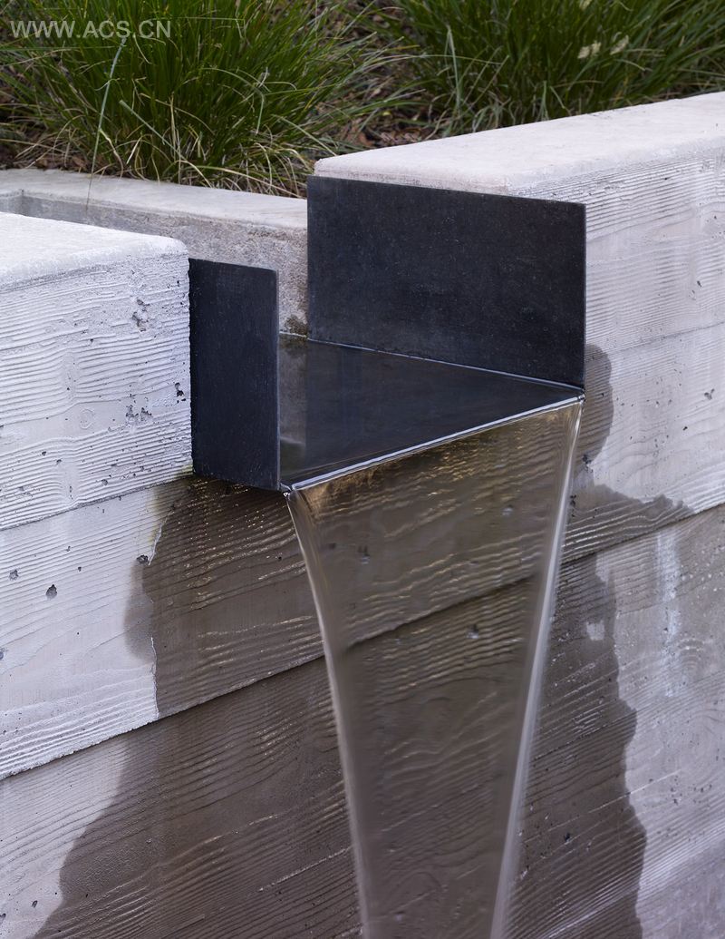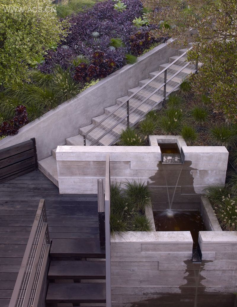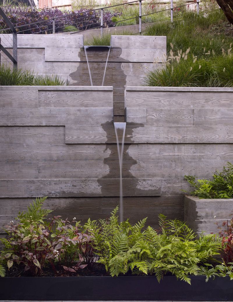 住宅依山而建,有十五英尺高,倚靠的小山丘被划分为两层花园。在主要的起居生活层,主卧室面向主要的可用平台空间。设计师面对的挑战(或者说是机遇)是如何将垂直空间整合成一个有机体。主卧室下面是一个花园,与住宅建筑相协调,用做聚会和接待客人等空间。这个花园平台空间通向小山丘的顶点,在上面可以一览只有在明信片里才出现的海岸美景。在较低的一层,设计师去掉了破旧的护土墙,应业主要求,引进一处水景观设计,另外通过嵌入式的分层墙壁巩固山体。水流过青铜堰,注入池内,为整个花园弹奏美妙的背景音乐。
