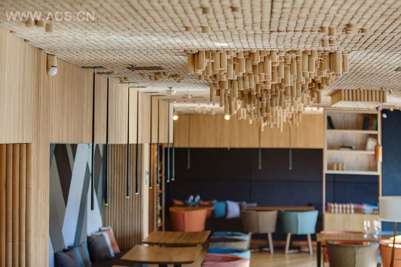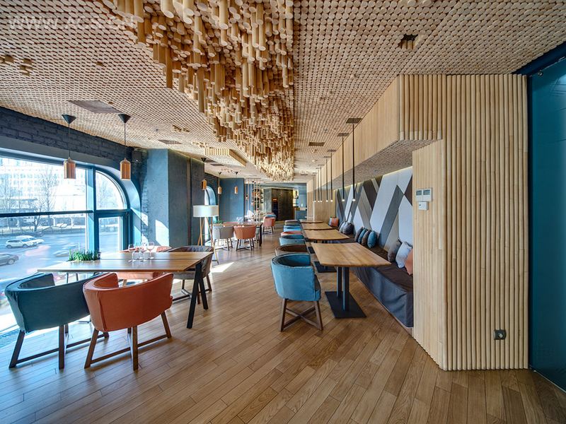 餐厅设计的优点是双层内设。依靠合理的空间区域布局来将不同群体的消费者的用餐空间进行隔离划分,尽可能地保证各自的私有空间。举例来说,一层建筑设有法式甜点餐台,而在玻璃幕墙隔开的另一区域则为儿童们设置了游戏场地。配合这一最初设计的灯光选用柔和色调。一层是餐厅,分割成了不同的就餐隔间,来满足无论是商务会餐还是家庭团聚等不同食客的需求,灯火设计成较昏暗神秘的色彩。酒吧也设置在此,设计的特点是客人在座上时的视线可以从落地窗观赏街边风景。