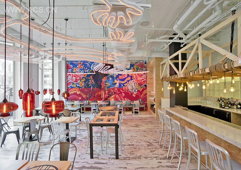 餐厅入口正对一个街道风格的走廊,这里安置着工业风格的酒吧。装饰墙面所采用的绚丽壁画来自秘鲁艺术家塞西莉亚帕雷德斯的作品“两个世界”。进门右手的宽大正式用餐空间中,用竹竿围出一个圆形桌子坐席区,此外这里还有舒适的沙发座和日式榻榻米坐席区。在再往里,就是一系列轻松欢愉的私人空间和专供秘鲁酸橘汁腌鱼的酒吧。餐厅顶部的霓虹灯采用了秘鲁南部古迹--纳斯卡古迹的线条风格。设计师将一系列简单要素:回收的板条箱, 从天花板悬挂下来的梯子,钢波纹板,玻璃砖墙面以及木桁架等等,精心搭配在空间之中。巨大的窗户让室内外的热闹连成一气。