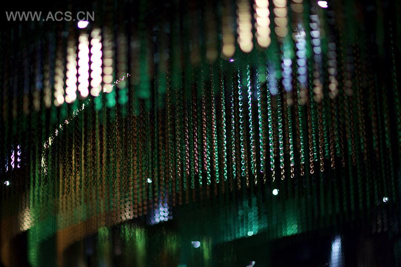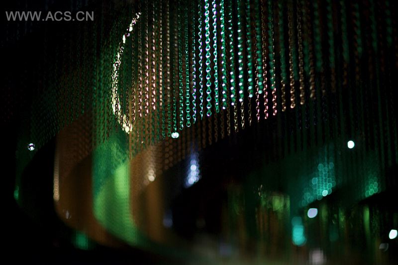 大概有95个单位的KriskaDECOR曲线挂帘装饰着大堂的天花板。使用的色彩包括绸缎褐色,绸缎黑色,绸缎咖啡色,绸缎绿色和闪亮的翡翠色。这些颜色的运用试图创造出大海底部和藻类的颜色。