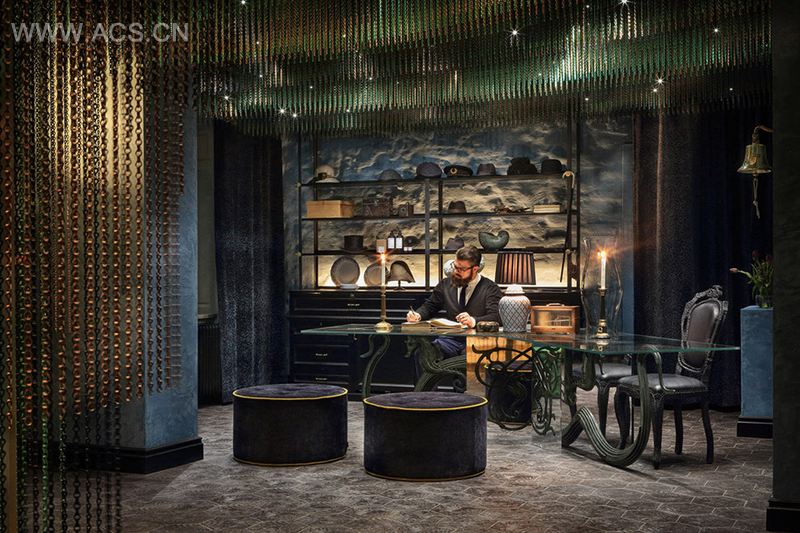 “反差是整个设计的概念——天鹅绒与帆布,浪花上的飞沫与香槟酒,”StyltTrampoli的创始人兼创意总监Erik Nissen Johansen解释到。“我们让大海再次回到酒店精致的大厅里。”