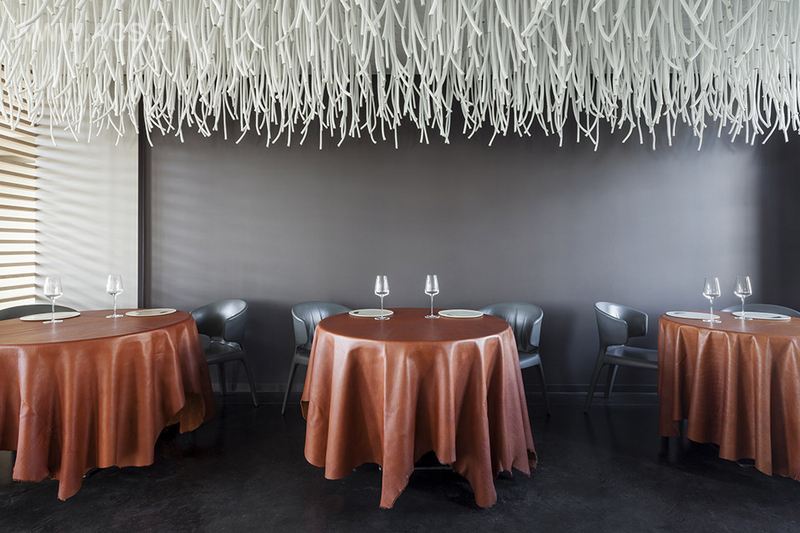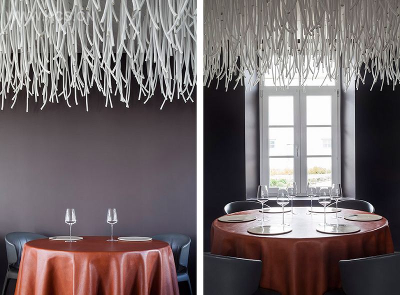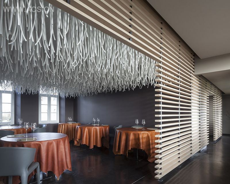 米其林二星餐厅L'Air du Temps的室内装潢以白色涤纶绳为主要材料,打造出一个抽象的“藤本植物”美学场景,体现了该餐厅厨师San的自然料理精神,创造出室内环境中独特的氛围,同时天花板上的涤纶绳能有效吸音。