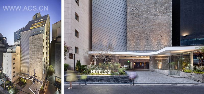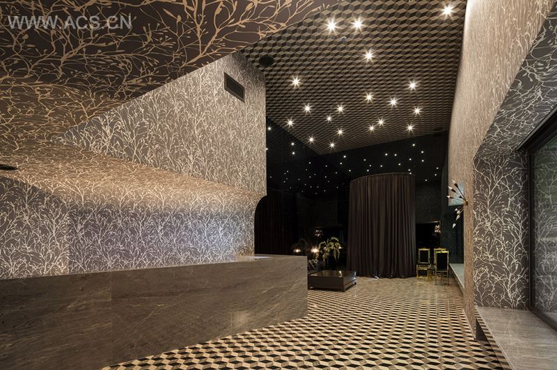 地板,墙壁与天花这个三个基本元素于房间,正如地面,柱子和屋顶于建筑。因此,建筑的古老历史可以解释为用双脚站在地面,用背部靠在墙上,和让身体藏在遮蔽之下。然而,这些看上去完全分离的元素,在这个项目中的处理方式稍有不同。原來用在地板现在应用到墙面和柜子,墙的某些部分与天花板相接,这样地面和天花板就像镜子一样反映着对方。能从阳台看到的外墙材料同时成为了室内的一面墙体甚至是围绕着整个室内空间。在酒店大堂,对又高又长的墙体顶部进行了弯曲和折叠,于是勾勒出前台及其上空的一个半圆弧区域。而装饰着首层大堂地板与天花的马赛克图案,同样也使用在顶层的所有地面,墙面以及倾斜的天花板上。