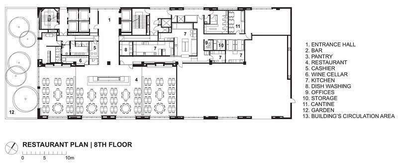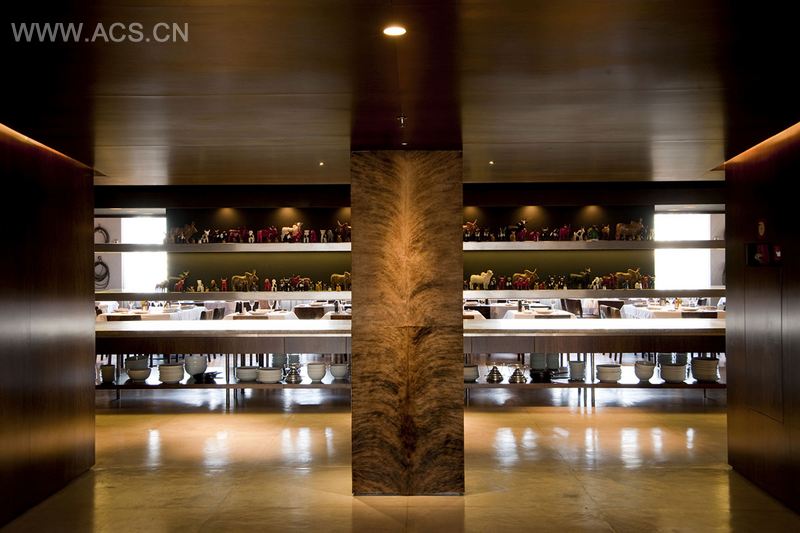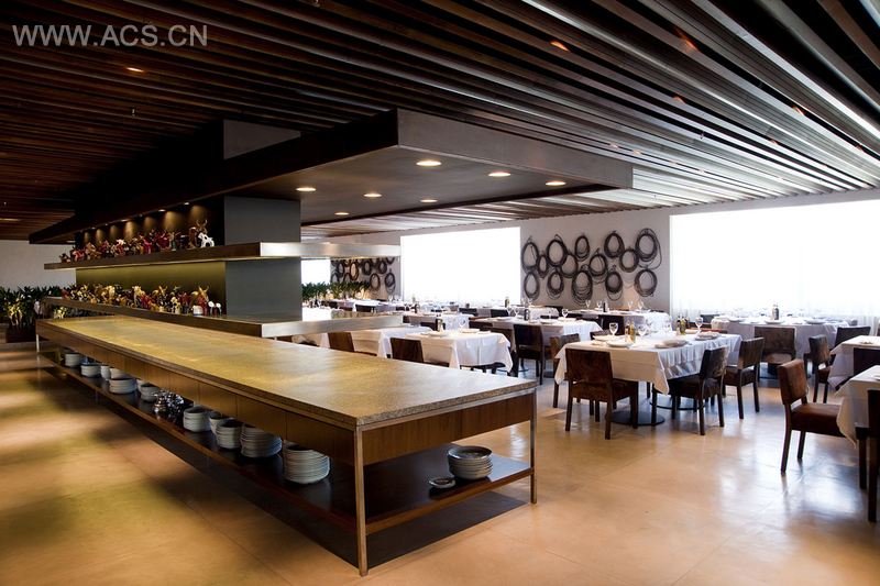 位于一楼的吧台是进入餐厅的必经之路,电梯能直通8楼抵达大堂。长长的烧烤台位于餐厅的中部,与餐厅中央的下沉空间一起将餐厅空间分成三部分。