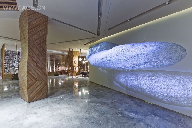 入口大厅覆盖着一层如天空般的白色曲折的天花板及墙面,丝绸般的蓝色屏幕字体将宾客从外面的纷繁世界带进一个抽象和宁静的接待空间。多功能展厅内悬挂着浮云状的临时艺术装置作品,通过微妙的投影与宾客的心灵产生互动。