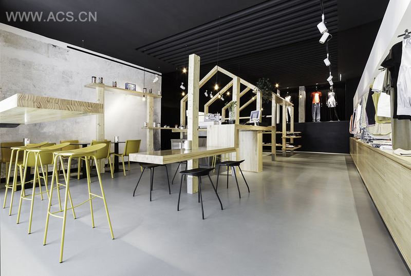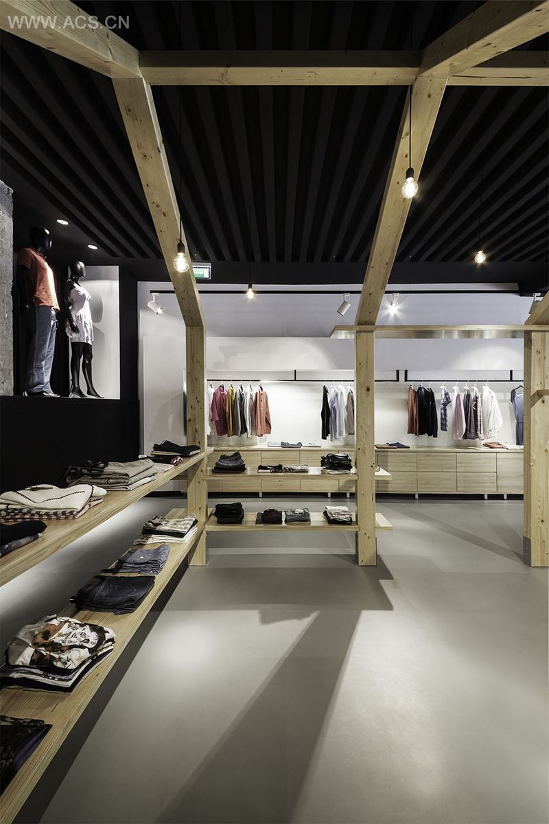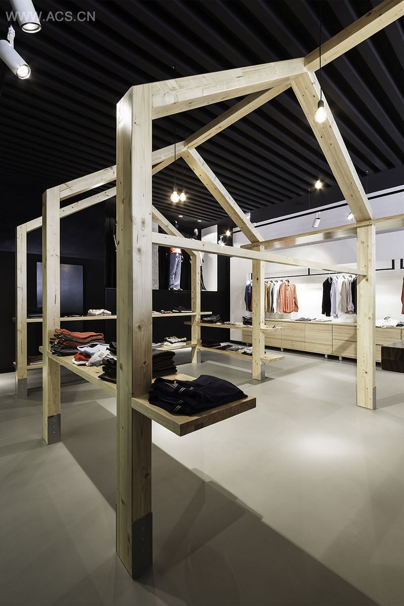 店里的家具既可以挂衣服,也可以用来展示。如此一来,所有的空间都被这个主要的木结构所分开,在这里顾客的将从试衣服中体会那份放松与休闲。材料的选择也遵循使衣服引人注目的原则。因此,墙壁保持原来的状态,地板则用树脂地板,也突出其自然状态。