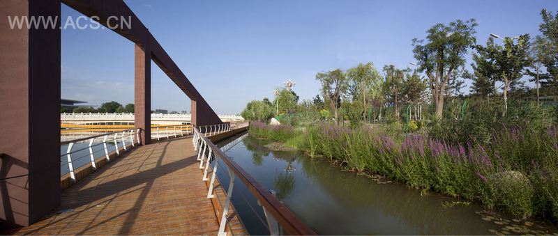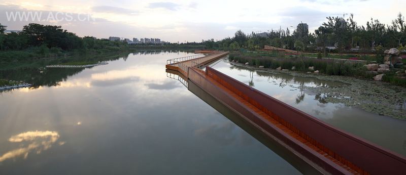 城市和滨水空间的距离非常大,它考验了设计师如何削减其间的距离。蜿蜒的波浪形人行道设计使城市和滨水区之间的关系更加紧密。通过打破僵化的景观线,暗示了河流的流动性和提高水的可体验性,并营建了一个更加有机和天然的环境。通过创造不同的俯瞰河景的空间序列,把这个生态滨水意象表象得淋漓尽致。