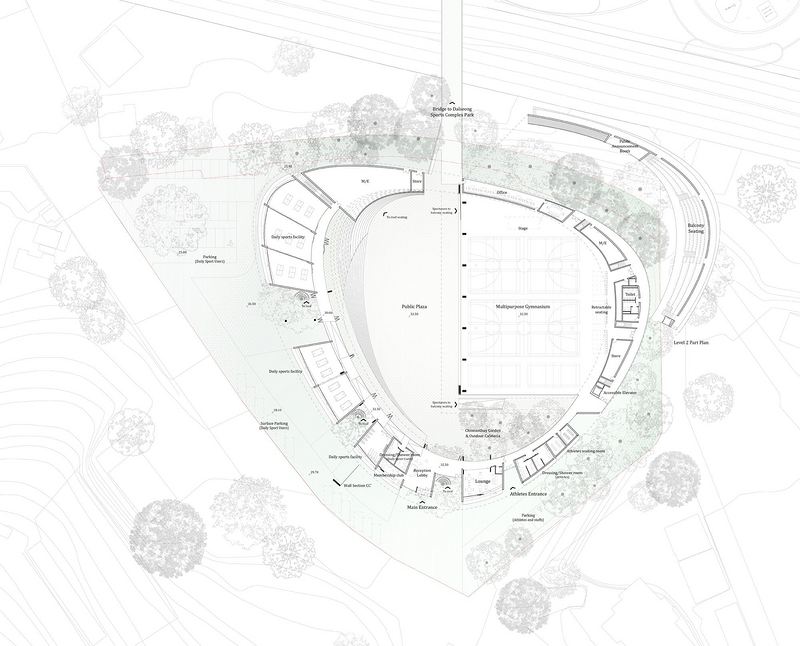 我们努力将周边的自然环境整合进该项目的空间体验里。该建筑坐落于有9米落差的坡地。通过切割和填充现有地形,我们将这块地重新整合成为一个缓坡地形,以方便人行道由路边通向基地中心。椭圆的环形形体被设置在了地形的最高处,并将细长的房间设置在面向人行道的一面,以获得充足的光照、自然通风、透明性以及透气性,同时,至少层高10-12米的多功能体育馆被设置在崖顶,成为从道路和邻近周边都能够看到的标志性建筑。