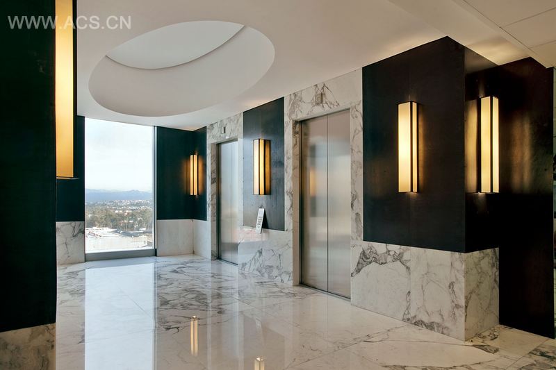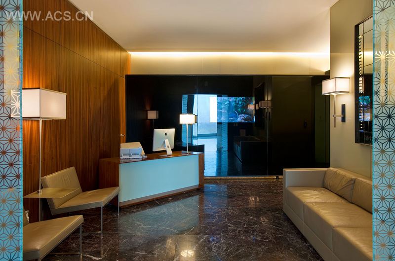 在电梯入口大厅,灰白大理石和褐色钢材板之间产生了一种矛盾的效果。通往接待大厅的通道,由于灯光的营造,仿佛变成了一块充满优雅而温暖气息的色板。这块区域中可以见到紫罗红大理石、帕帕加约木质墙板以及带有时隐时现悬浮LCD屏幕的黑色水晶玻璃。