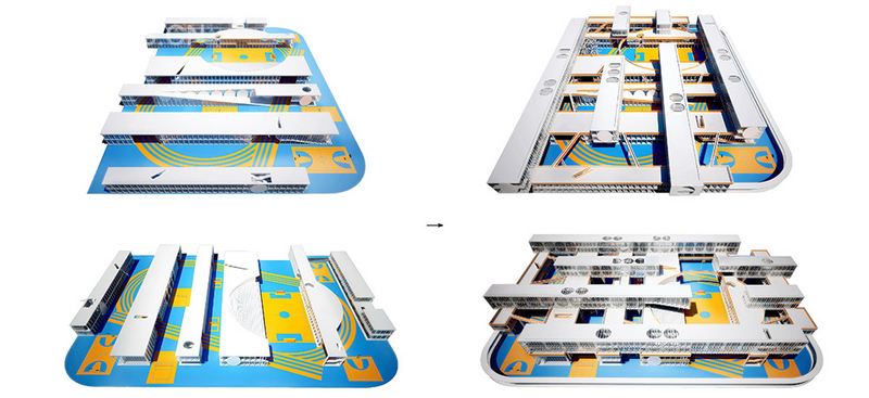 具体来说,我们把空间分成了上下两部分。上面是所有的普通教室和办公室等相对规整的功能,他们南北向布置,获得最好的采光和通风;而下面是可以更加开放的功能,比如图书馆、运动馆、食堂、活动室等,他们东西向布置,像城市展开。
