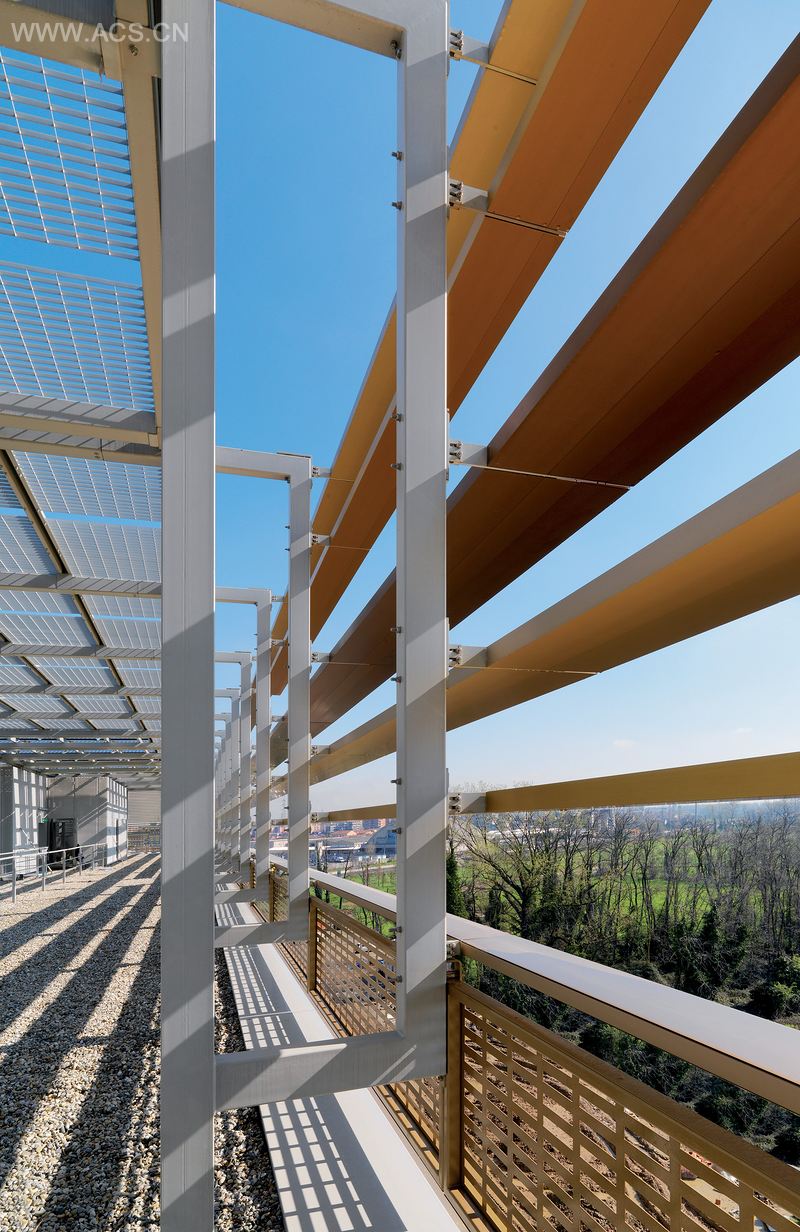 通过建筑所在背景下的环境分析,屋顶和立面设计采用了一种积极的解决方案。太阳能光电板被融入了设计中,在为建筑提供能源的同时也赋予了建筑一种闪闪发光的高科技美感。