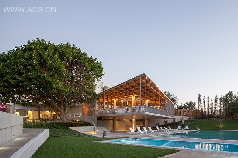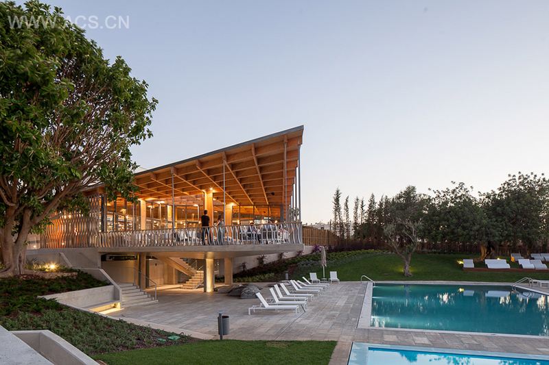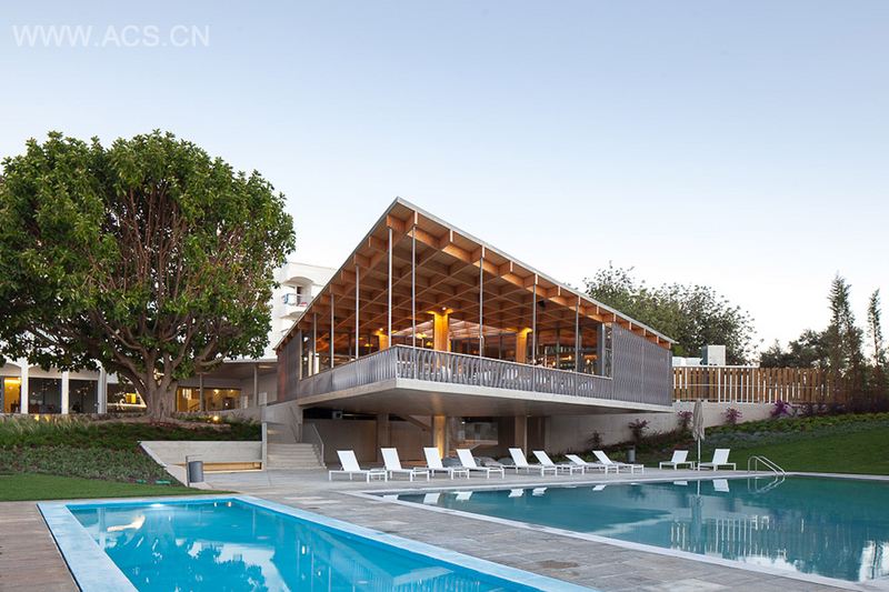 建筑面向泳池,底部挑空,二层大屋顶采用了更省材料的格栅式构架,中心开一个方洞改善采光通风条件。扶手栏杆的花纹与玻璃幕墙外的遮光栅栏的花纹一致,并合并为一个整体。整个建筑看起来通透干净。这也是建筑师通过谨慎使用材料而最终追求的结果。在这个项目中,他们运用瓷砖材料定义整个建筑的质感与氛围。