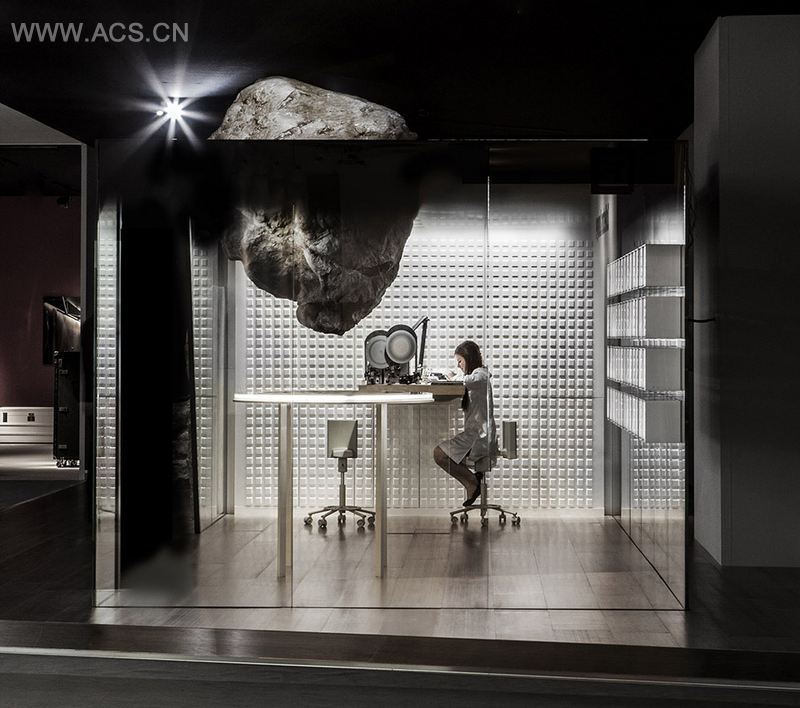 Mathieu Lehanneur告诉我们:“我的灵感来自自然,技术还有设计。利用与名表息息相关的双湖谷(瑞士名表摇篮之一)美丽风景联系历史,并把这些展示给全世界。”精美的腕表与玻璃,木材,石材等材料形成了对比。而那些漂浮的失重石材就像是阿凡达电影里的世界,标志着这个场所拥有无限神奇可能性。