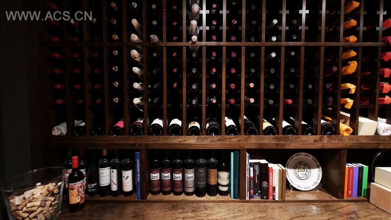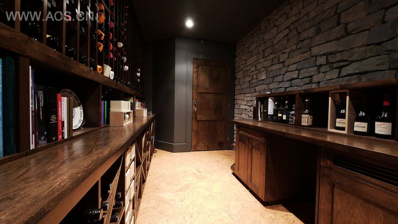 我们的客户是狂热的红酒和书籍收藏者,希望自己的酒窖能够结合这两个爱好。因而书架和他们最大的书一般高,和磨坊一样长。酒架每排可存放11个酒瓶,下方有一个与酒盒一般大小的陈列空间。沿着左边墙壁放置的陈列柜遮住了制冷系统和酒具。酒窖内还配备了电子酒侍与红酒管理系统。