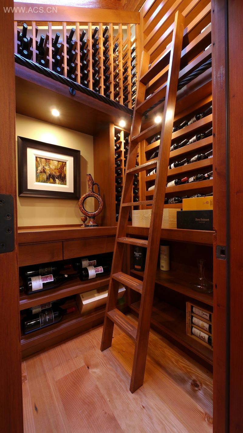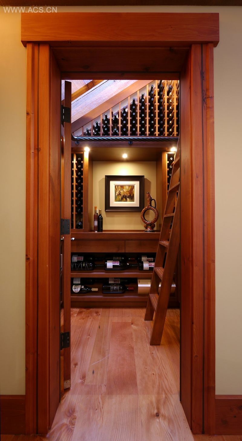 工作台是由我们整修店面回收的牲口棚木头制成。楼梯也是由从客户那回收的木头制成,他们的阁楼卧室建了相似的楼梯。楼梯沿着结实密集的电线,这些电线是回收的集材设备。而这整个房间是由原先的室外甲板空间改造而来。这儿有一个梅格纳姆和双梅格纳姆酒瓶,在拱门下方的显示器上贴标签,右下方放着存储箱。右手边的墙上有存放750毫升瓶子的空间,要在仓库贴上标签。
