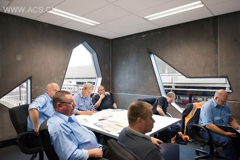 砂石瓦砾的铁路站场之间,在5号和6号月台的尾端,V型轨道相背离而形成的中部空间中坐落着Yardmasters大楼。这是一栋多功能建筑,是南十字铁路站场的各工种工人和操作员们的办公场所。