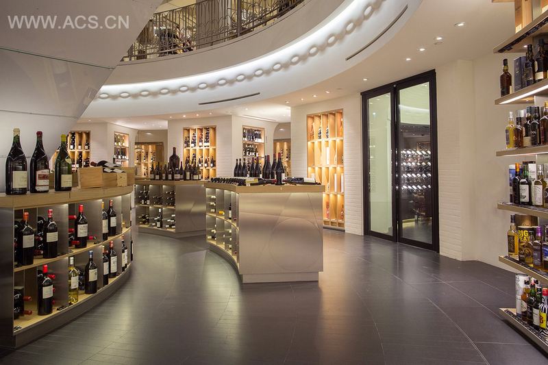 “La Grande Epicerie”食品店位于巴黎著名的乐蓬马歇百货商店内。随着百货商店的架构重组和翻新,负一层有了更多的空间,原红酒专柜La Cave得以扩建并完全转型为酒窖。而今一楼La Grande Epicerie食品店中央的半圆状入口以及新电梯连接了老店面与新酒窖。