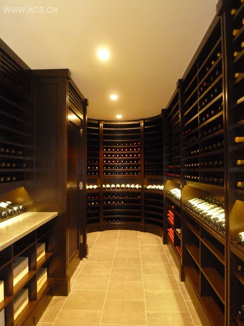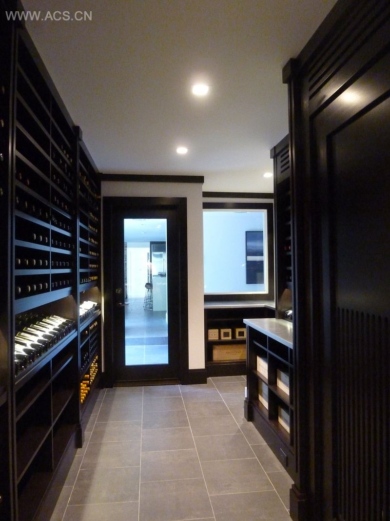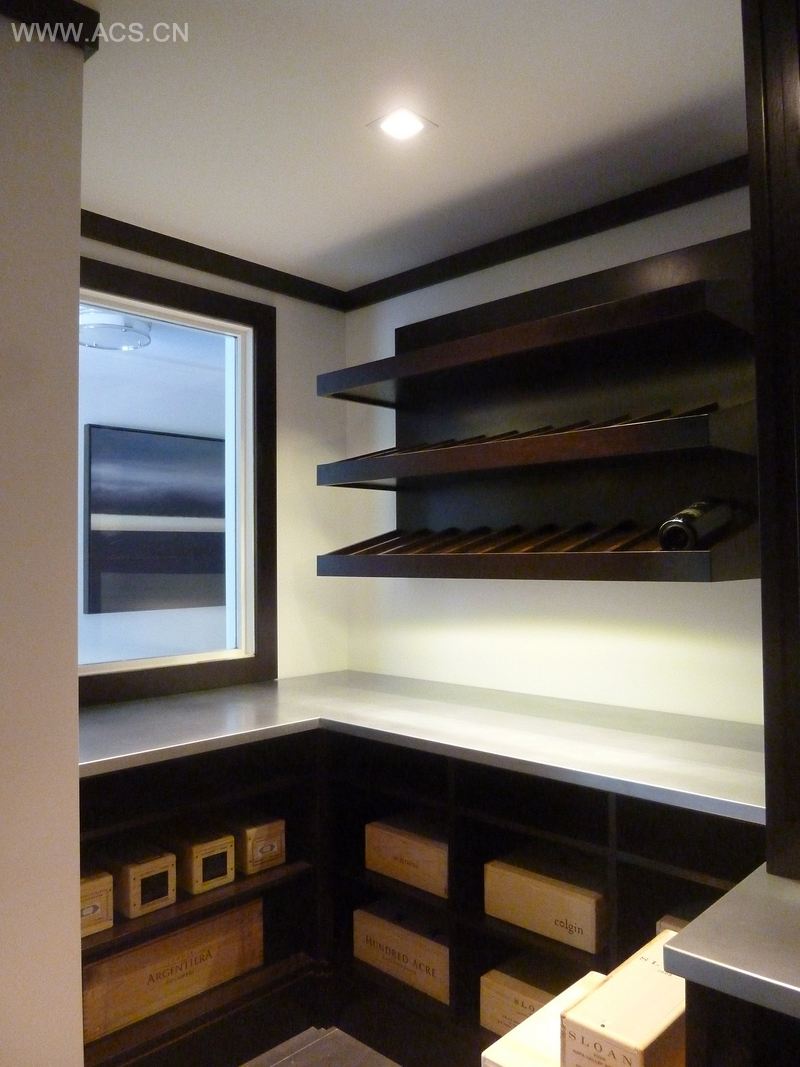 这个长而弯曲的房间可以运用一个有趣的设计理念。该酒窖用现代的方式诠释了传统酒窖。整个房间运用了水平架子和展示柜,而不是单个的架子和钻石陈列架。橱柜用红木制作而成 ,褐色核桃木以及哑光漆的运用能更好的搭配旁边厨房的那些柜子。我们使用了锌台面而不是石材是为了更好地衬托木材的暗斑和延续酒窖的现代化风格。我们安装了LED灯来凸显环绕整个房间的陈列柜。最后,在房间后方的角落我们安装了一个三层的悬浮式陈列架来展示大瓶装的红酒。 酒窖前方的玻璃门窗能让我们更加赏心悦目地从走廊欣赏酒窖。该项目由建筑设计咨询有限公司于2013年完成.