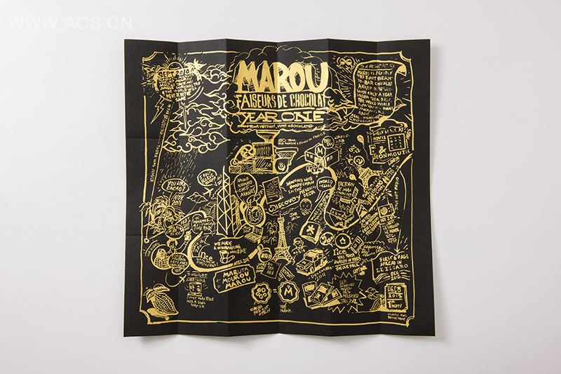 We stayed up very late one night, recalling all of the key events Marou had been through over their past year, and scrawling out a sort of treasure map. This map was screen printed in Marou gold and folded into the size and shape of one of their chocolate bars.