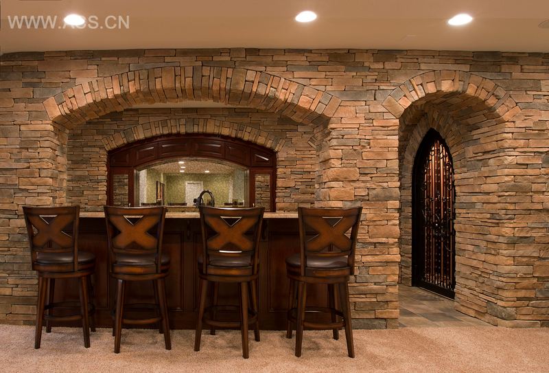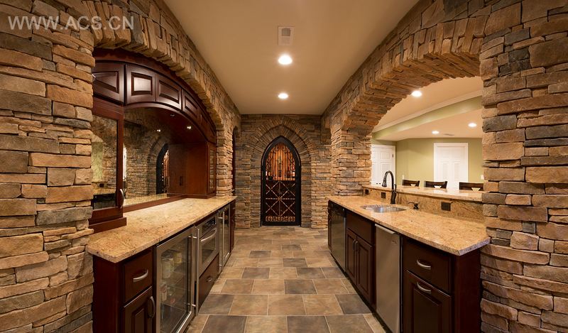 此地下室改建计划包括了一座石制酒窖和定制铁门,采用了多层次而夸张的哥特式尖拱。酒窖内部由未抛光的弧形红木酒架组成。酒架的中心呈弧状,以呼应铁门。金属灌灯和壁灯可以调节灯光并营造出宜人的氛围。酒窖旁边是一个由弧形的高杠柜子和红酒台、壁龛衬托的小酒吧。石柱和拱门将这两个区域结合起来,营造出非常庄严的整体外观。
