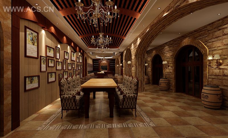 该酒窖富丽而宽敞,色调和挂饰华丽,同时也带来庄重典雅的感觉。
