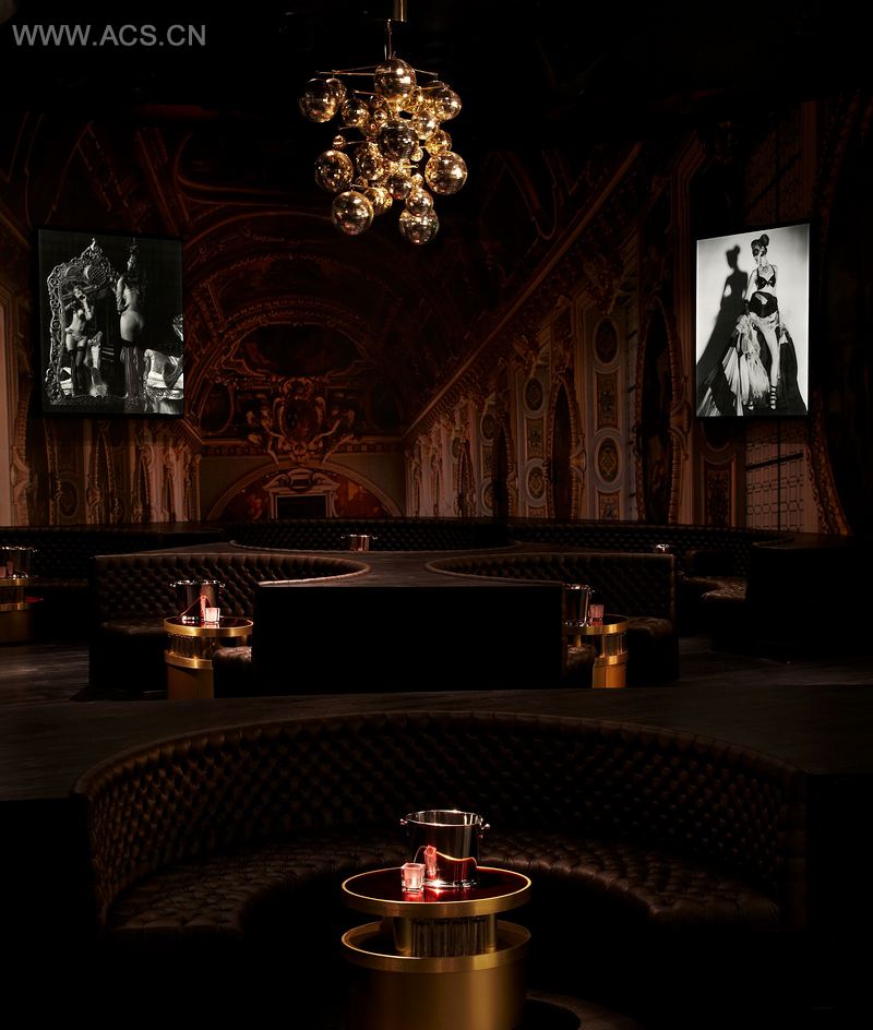 在这个18000平方英尺的夜店设计中,充满了私密与开放的碰撞。出现了三个独特的空间,每个空间都设计各异。红色的空间有着三维透镜摄影,跟随着顾客的移动,增强了空间的神秘感。温暖的照明和反射表层如梦似幻,充满了金色的空间。主要空间的特色是一个被提高的DJ舞台,周围是座椅区,通过平台相连,给顾客提供了互相交流的体验。迷人的沙发椅给空间增添了奢华的感觉。每个空间都促使顾客去探索下一个空间,彼此和谐一致,为每一位顾客提供自由和新颖的体验。画廊会所吸引着那些喜爱亲密、艺术灵感以及稍许性感的人们。