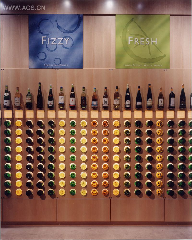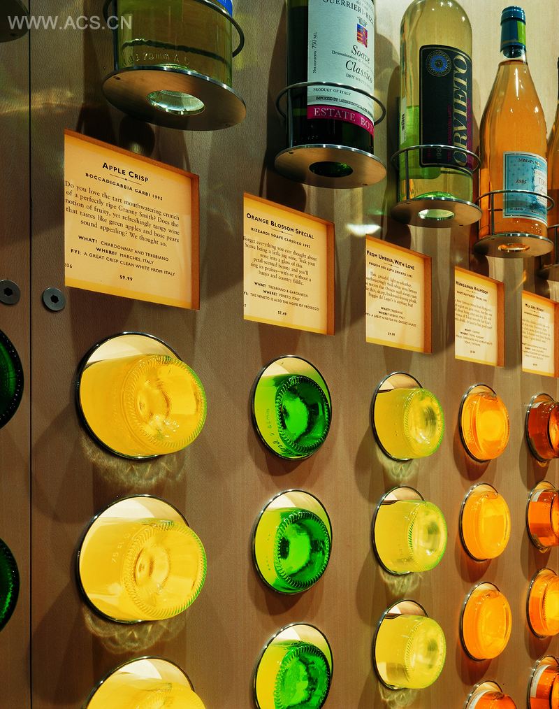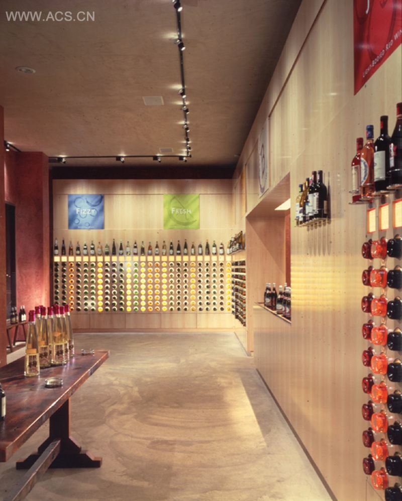 罗克韦尔集团的设计为极度传统的行业注入了新的理念。隔板装置是背光的,这样光就可以从酒瓶渗出,给店面增添了色彩,红酒和酒瓶本身则在设计中起了主要作用。各种酒瓶的颜色交相辉映,流光溢彩。 店面内部的装饰巧妙地结合了美国梧桐木和手磨勃艮第石膏墙,地板则是柔和的灰色光滑水泥地。