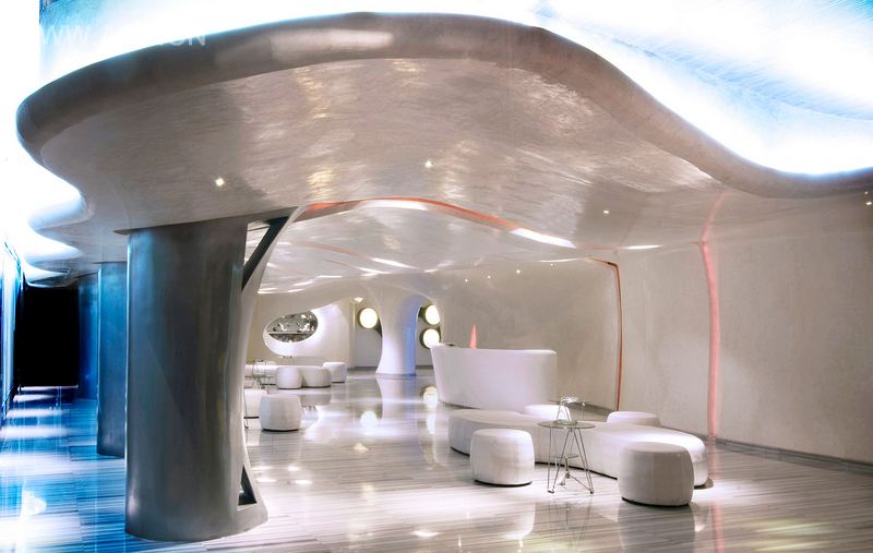 入口处的设计,火红的色调和具有韵律感的形状让人感受到武汉的热情。镜面和LED屏的搭配放大了入口空间,创作出中庭的感觉。起初的设计理念是红色的火苗,随后设计师从卖火柴的小女孩联想到红与白的设计理念。小女孩每次点燃一根火柴,就会看到她梦想的事情,纯白的梦想与火焰的碰撞,让其燃烧得更久更明亮。火红的入口与纯白的云相遇。热情的音符在石质地板上反射,如同在超现实主义的黑白钢琴琴键上弹跳。自由漂浮的云状沙发,人们可以在此休息,感受这如同从九重天坠落而下的真实美景。年轻的人们可以在这个梦幻般的“音符”中尽情欢唱。