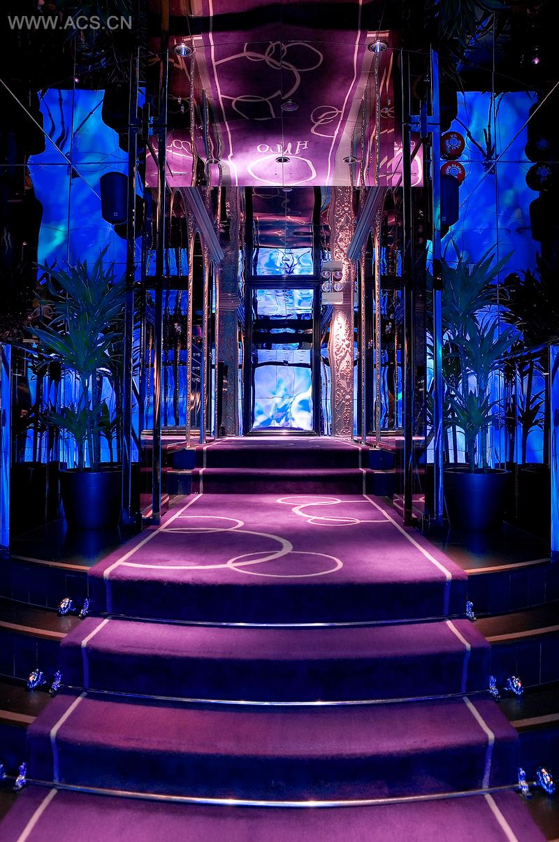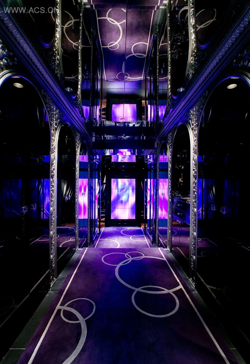 到达这里后,在通过两个弧形入口之一前,客人必须通过高科技的面部识别系统获得进入的权利。紫色的LED照明增强了环境的氛围,弯曲的楼梯通往大型的等离子显示屏上生动的动态影像。在这里,客人被卷入其中一个地下内庭中。